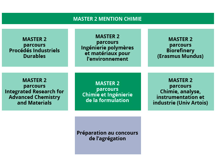 La formation consiste en 6 mois d’enseignements théoriques et pratiques (cours, travaux pratiques, projets) de septembre à février suivis de 6 mois de stage en entreprise ou en laboratoire de recherche à partir de mars. Le master 2 Chimie et ingénierie de la formulation s’organise autour de 7 Blocs de Connaissances et de Compétences :